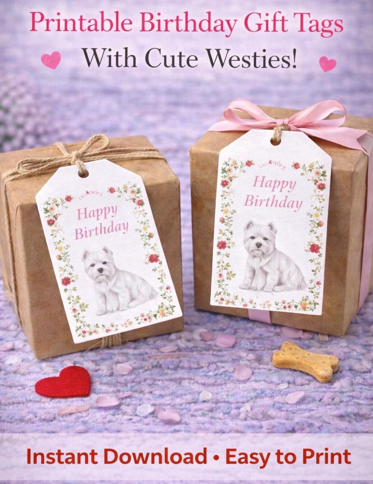 Celebrate a birthday with this adorable Westie “Happy Birthday” printable gift tag — perfect for West Highland Terrier lovers of all ages 🎂🐾 This PDF printable is an instant download, making it ideal for last-minute birthday gifts. ✨ Perfect for: Westie lovers & dog parents Birthday gifts and treat bags Cards, flowers, and gift wrapping Handmade or small shop packaging